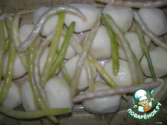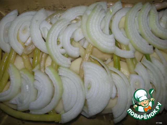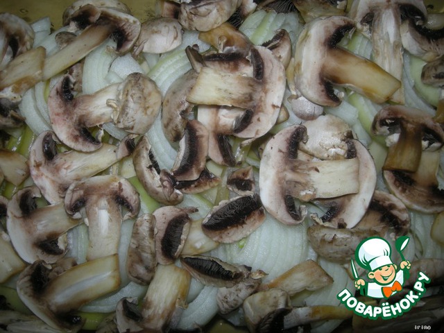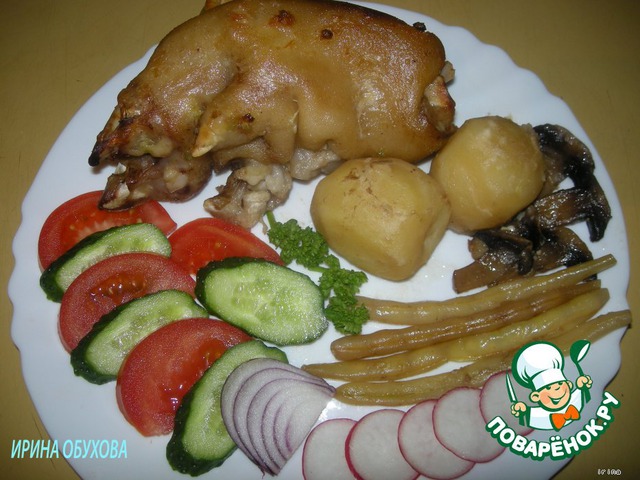 Дальше – отварные свиные ножки. Все залить сметаной, смешанной с измельченным чесноком, и полить вином. Форму закрыть крышкой.