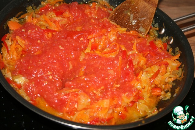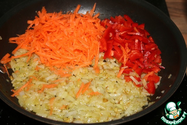 Поджариваем лук до золотистого цвета, добавляем морковь и болгарский перец, оставим тушиться