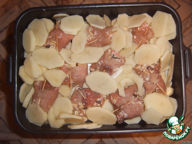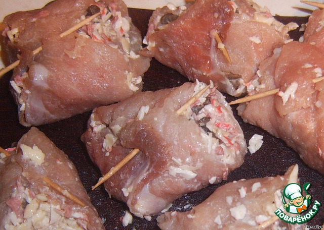 Мясо скрутить в форме конвертиков, внутрь положить начинку (я бы конечно лучше их полностью cделала закрытыми, но отбивные были небольшого размера).