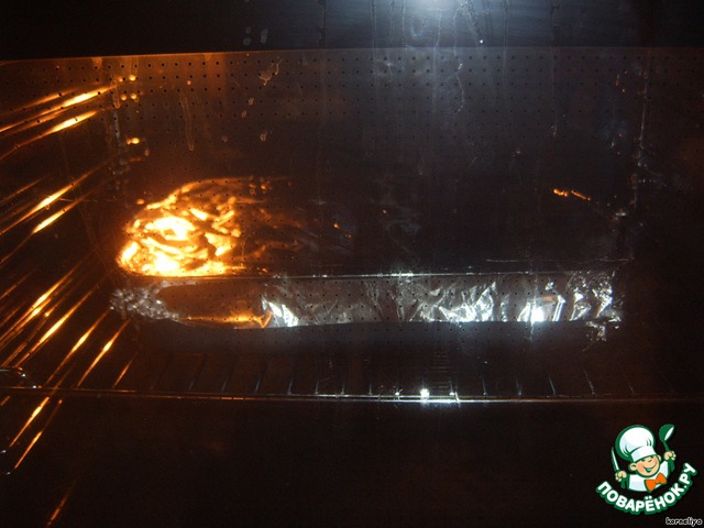 Закрыть фoльгой и поставить в разогретую духовку до 200 градусов, через час убрать фoльгу и убавить температуру примерно до 170 градусов - до готовности.