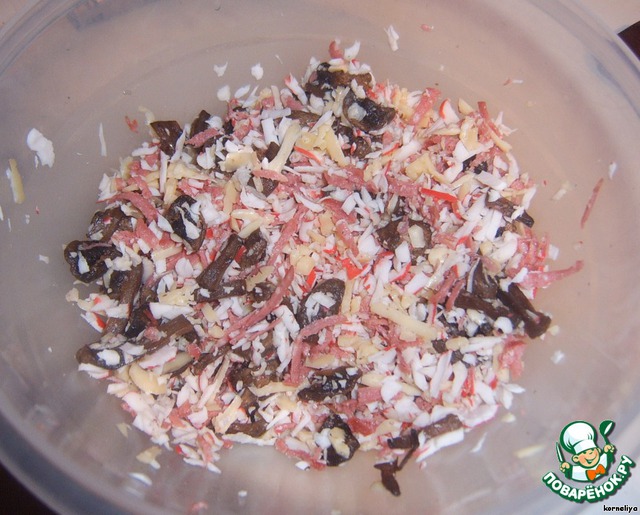 Для начинки: обжарить грибы (можно с луком, кто любит), на терке натереть: сыр, колбасу, крабовые палочки, добавить майонез.