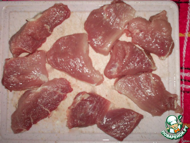 Мясо нарезать на небольшие кусочки, шириной примерно 1,5см.