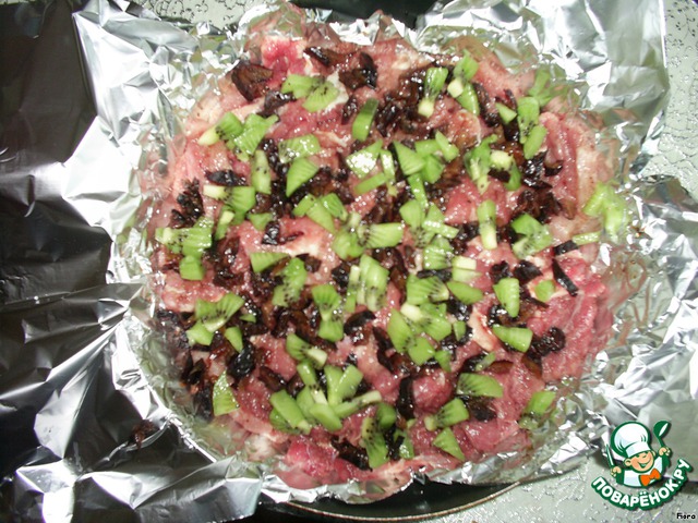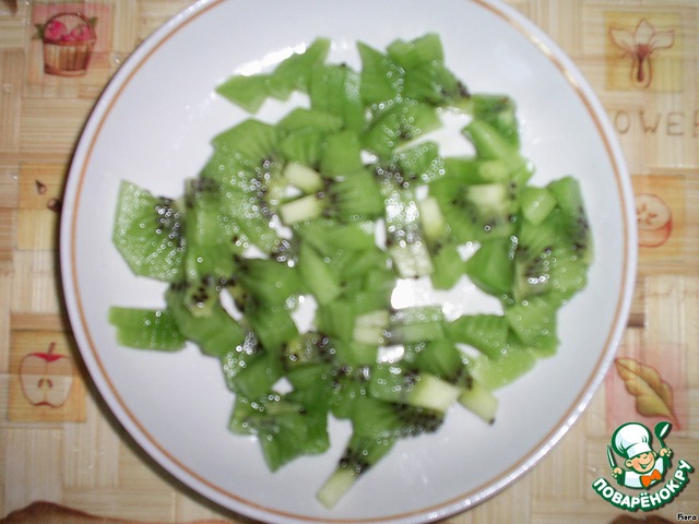 Чернослив замочить в теплой воде, киви очистить и мелко нарезать.