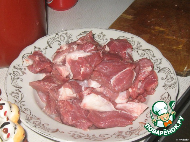 Мясо (свинина, индейка, курица, говядина) порезать средними кусочками
