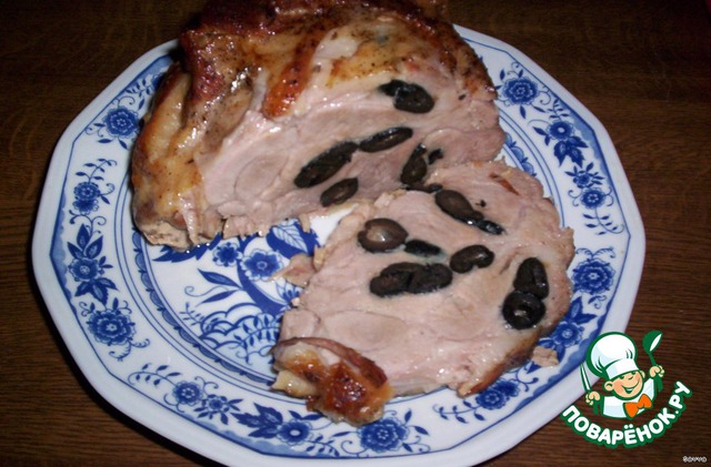 - сделать ножом по всей длине жировых прослоек отверстия, заполнить маслинами