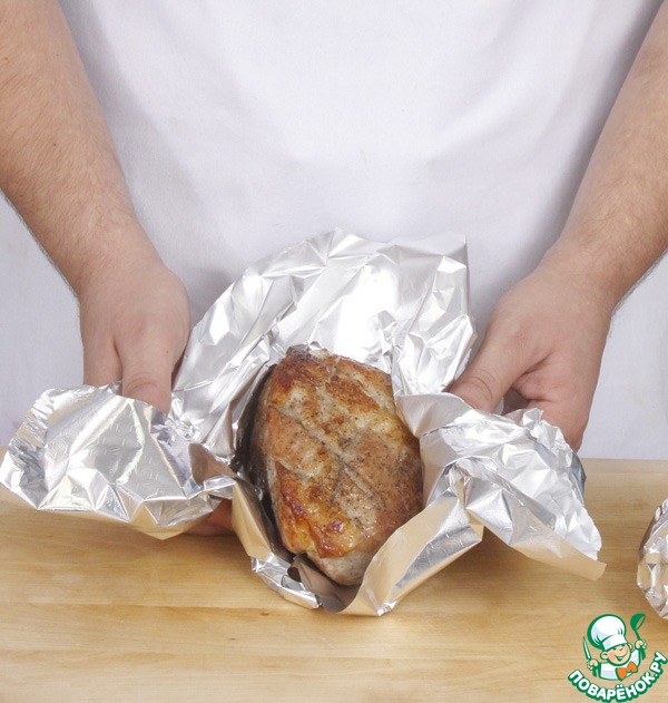 Переложить готовое мясо на доску, свободно обернуть фольгой и оставить отдыхать на 1 час.