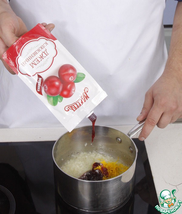 Разогреть в сотейнике масло, обжарить лук до мягкости, 2 мин. Добавить джем, апельсиновую цедру и сок. Варить, помешивая, на медленном огне 12-15 минут, до загустения. Накрыть и готовить на медленном огне 20 мин. Остудить.