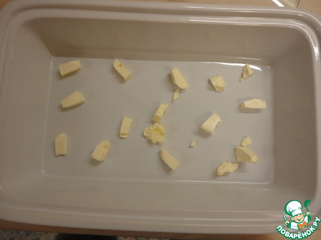 Духовку включаем на 180 гр. В форму с крышкой выкладываем кусочки сливочного масла.