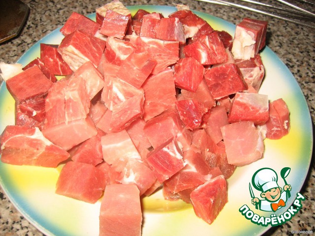 Режем мясо кубиками. Я люблю смешивать мясо, но можно, конечно же, и из одного вида.