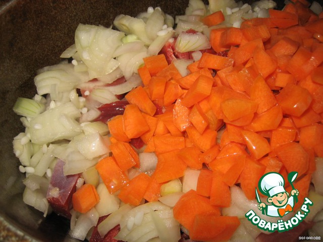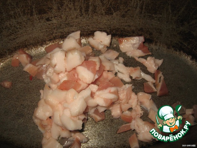 Срезаем со свинины сало и жарим до корочки, чтоб вытопился жир. Это вместо масла будет)))
