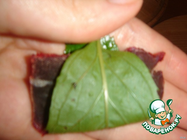 Возьмите в руки кусочек бастурмы и оберните вокруг него листик мяты.