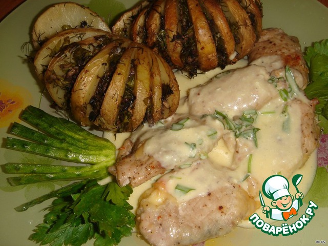 А на гарнир лучше всего подать отваренный рис или картошку. У меня сегодня в качестве гарнира была [url=http://www.povarenok.ru/recipes/show/9325/]картошка-гармошка[/url]