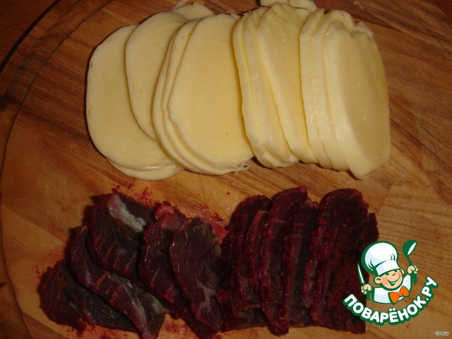 Сулугуни и бастурму порезать тонкими кусочками. По 12 штук.