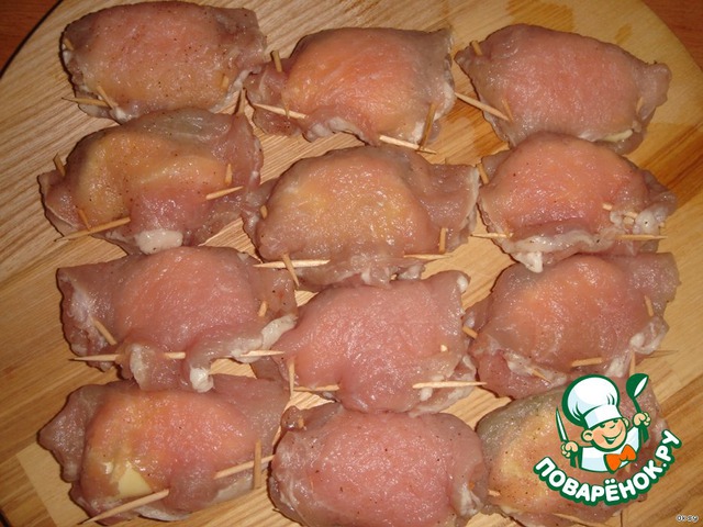 Эту конструкцию оберните кусочком отбитого мяса и заколите зубочистками. Получается мешочек или конвертик.