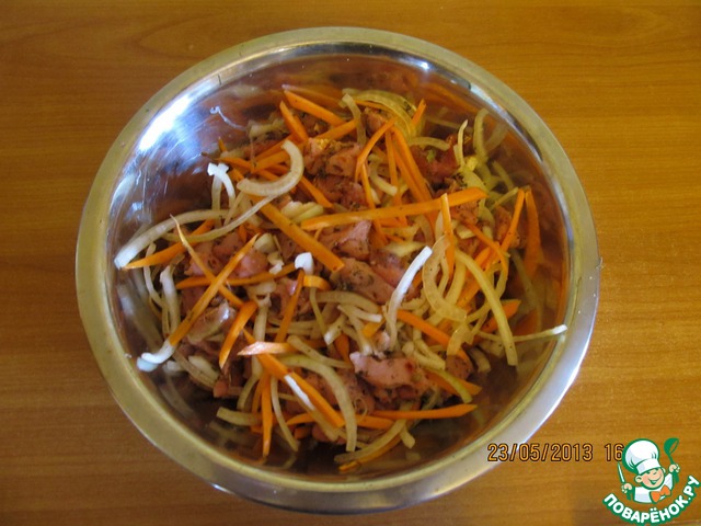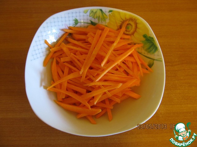 Морковь режем тонкой соломкой.