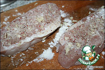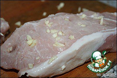 Берем толстые кусочки свинины, делаем в нем надрезы и шпигуем кусочками чеснока.