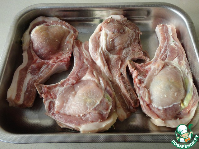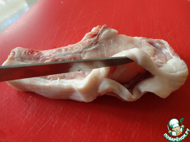 Берем кусок мяса, моем, промакиваем его бумажным полотенцем. Со стороны, где нет косточки, делаем не очень большой надрез и аккуратно прорезаем кусок изнутри, чтобы получился карман. Сделать это легко, обхватив кусок мяса ладонью, чтобы чувствовать пальцами нож и не прорезать мясо.