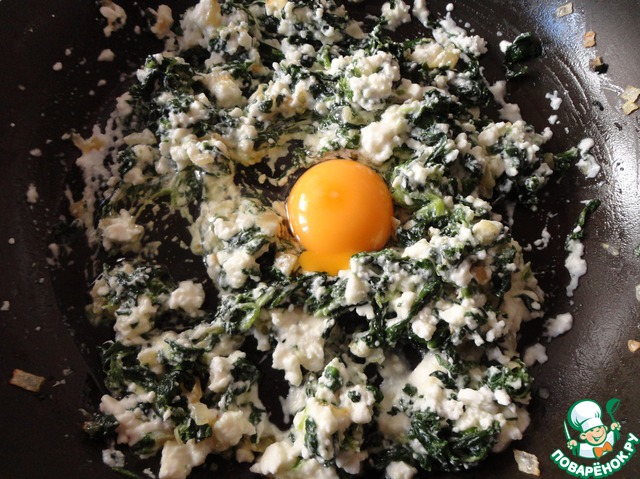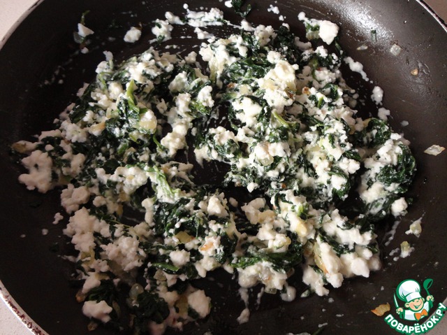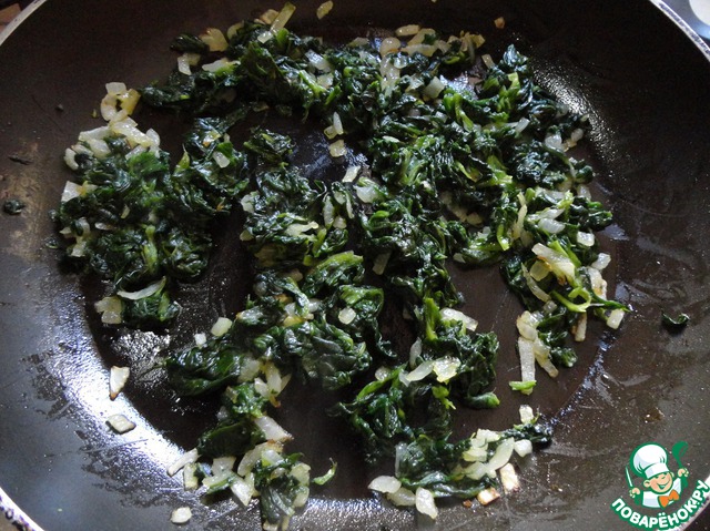 Добавляем шпинат, перемешиваем, даем потомиться вместе с луком. У меня шпинат был замороженный. Оговорюсь, что в источнике свежий шпинат следует немного отварить в небольшом количестве воды и отжать. Я, даже когда использовала свежий шпинат, просто нарезала его и томила под крышкой вместе с луком, не отваривая.