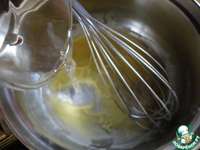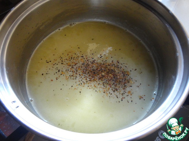 Последним постепенно вливаем горячий бульон, постоянно помешивая. Добавляем приправы. Количество бульона можно регулировать, делая соус гуще по вашему вкусу. Соус также можно сделать заранее, разогрев его перед подачей и добавив немного бульона, если он стал более густой.