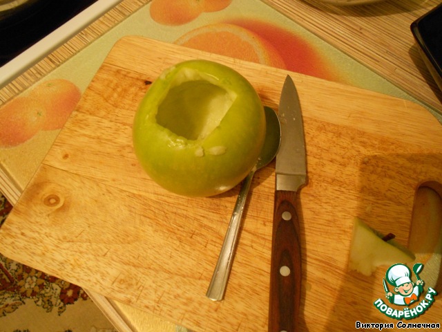 Очень аккуратно, чтобы не продырявить яблоко насквозь, удалите мякоть и семечки, оставив тонкие стенки.