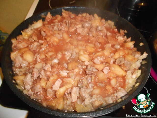 Добавьте к мясу томатную пасту, затем эль. Потушите 2 – 3 минуты и добавьте нарезанные яблоки. Потушите все вместе еще пару минут.
