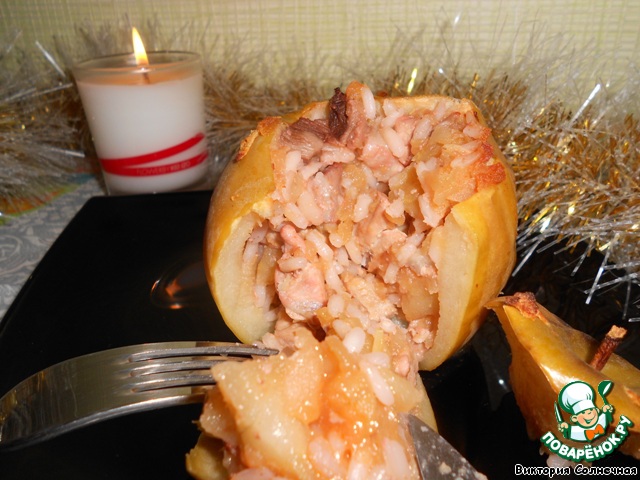 Отварите рис до полуготовности. Соедините его с яблочно-мясной массой. Нафаршируйте этой смесью яблоки.