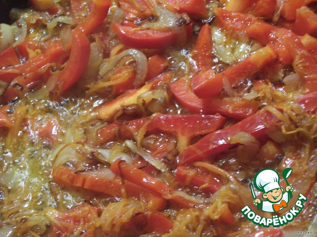 Из того казанка, где жарили мясо, вылить жир, кладём туда мясо, добавляем немного того жира, в котором оно жарилось, всыпаем лук, морковь и перец - перемешать.