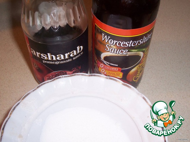 Смешать соевый соус, гранатовый соус и сахар, добавить полстакана воды и хорошо перемешать.