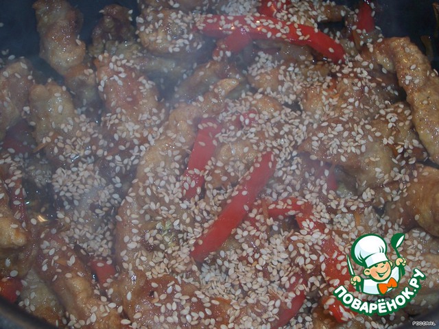 Вылить этот соус на мясо, всыпать кунжут и жарить минут 10, всё время помешивая, чтобы мясо приобрело коричневый цвет и было всё в соусе и кунжуте.