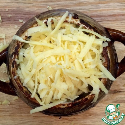 За 10 минут до готовности достаем наши горшочки и посыпаем сверху тертым сыром. Ставим еще на 10 минут уже без крышки.