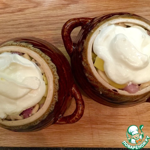 Сверху на каждый кладем столовую ложку сметаны. Закрываем крышечками и отправляем в духовку при 200 градусах на 80 минут. Приглядывайте, духовки разные! Смысл в том, что продукты готовятся в собственном соке! Грибы, мяско, картофель... ммм...