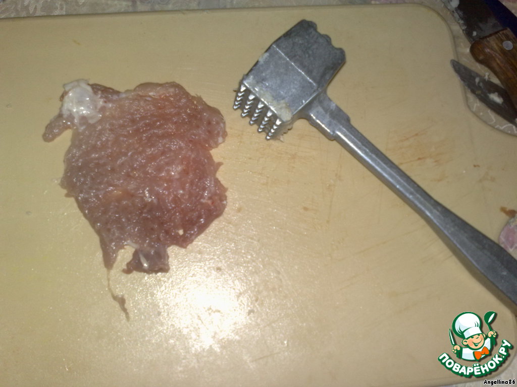 Мясо нарезать на кусочки, хорошо отбить с двух сторон. Посолить, поперчить.