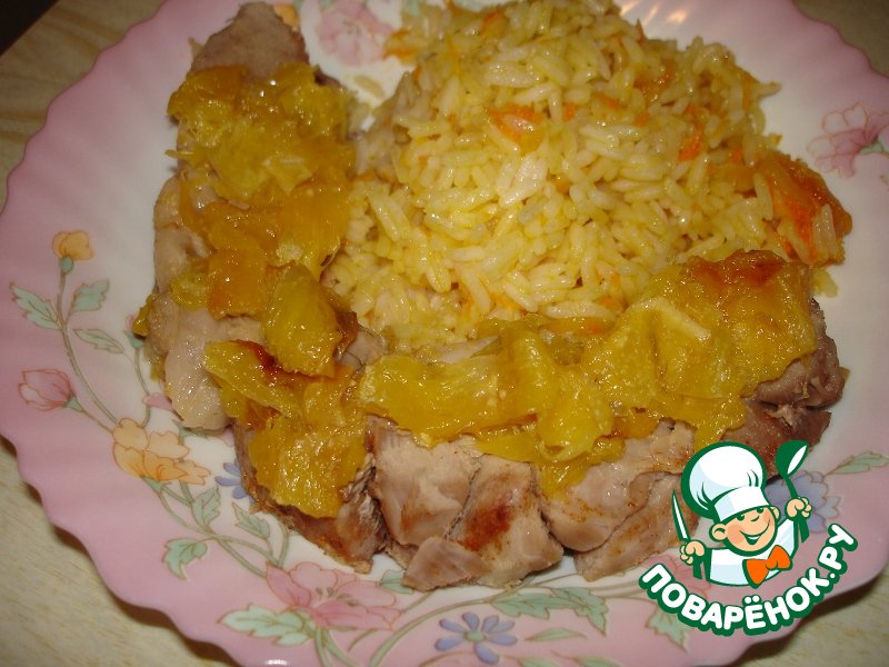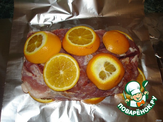 Мясо порезать кусочками, сверху выложить мякоть апельсина.