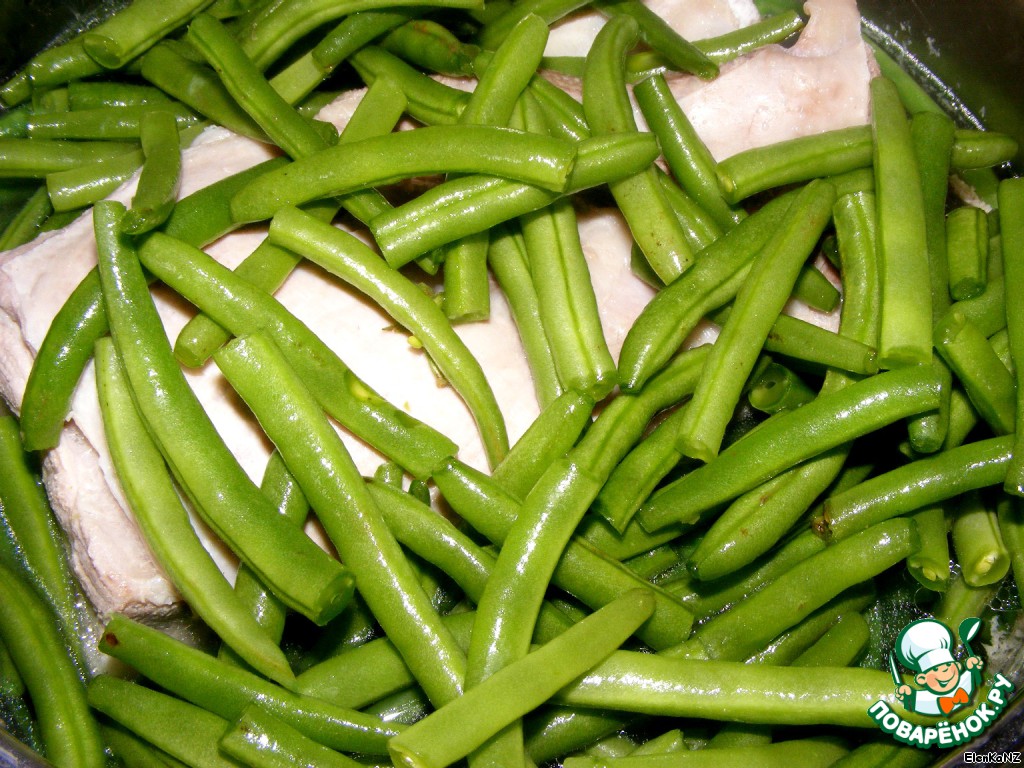 Тем временем промоем, очистим фасоль и нарежем на части. Грушу вымоем (по рецепту не чистим и целиком кладем к мясу), но с груши я срезала кожицу, порезала на 4 части и убрала косточки, потому что на фото из книги, груша чищенная и порезанная (несоответствие перевода и фото).