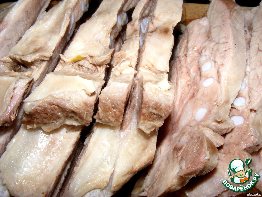 Вот такой кусочек корейки я купила, чуть больше 1 кг (по рецепту надо было 400 гр). Не половинила.