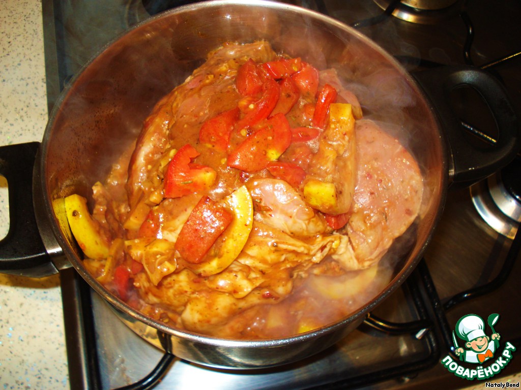 Маринованное мясо со всем содержимым высыпаем в кастрюлю, на дне которой немного подсолнечного масла, слегка обжариваем и наливаем 1 литр воды, тушим в течение 40-50 минут.