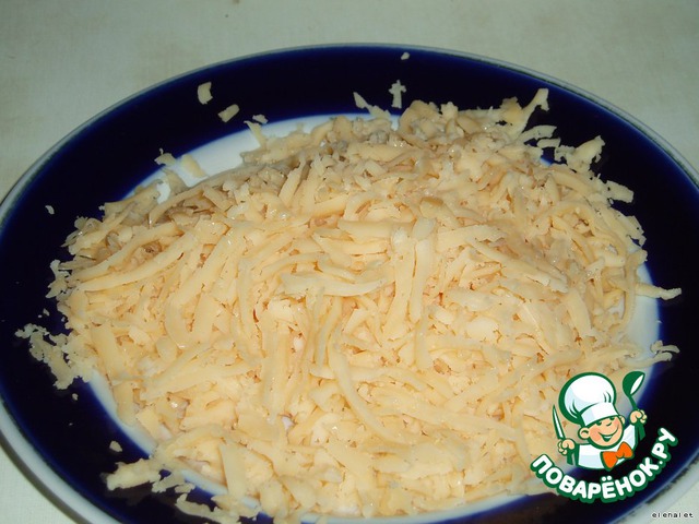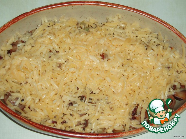 Посыпаем сыром. Нагреваем духовку до 180 градусов и ставим в нее мясо.