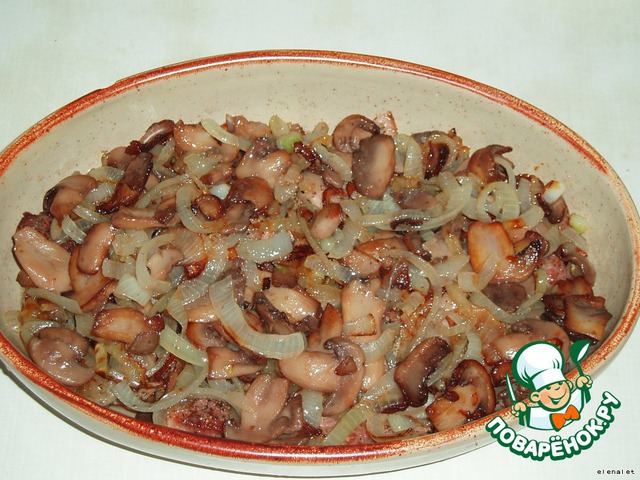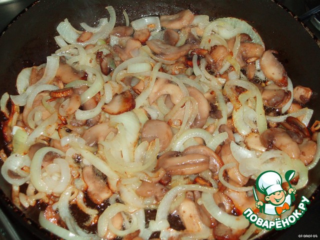 Смешиваем грибы с луком, слегка обжариваем все вместе.