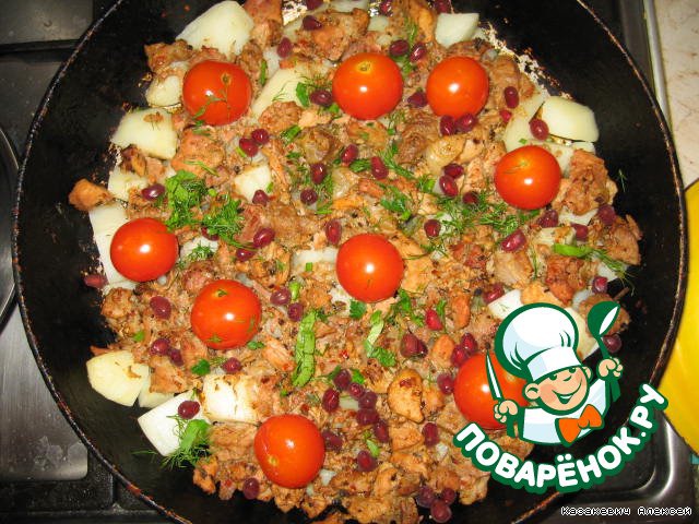 Сливаем воду и выкладываем картофель на сковороду (смазать растительным маслом). На него выкладываем мясо и томаты черри. Запекаем в духовке при 180 град. в течение 15 минут.