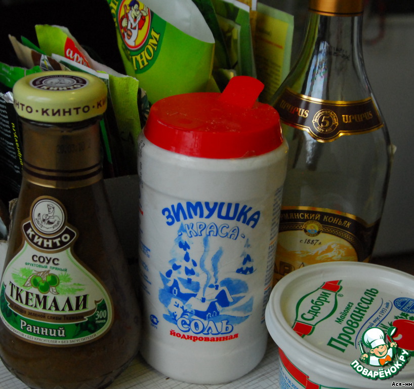 Для маринада берем по 1 ст.л. соуса ткемали ранний, майонез или сметану, добавляем мелко порубленный зубчик чеснока, соль и специи по вкусу, вливаем коньяк.
