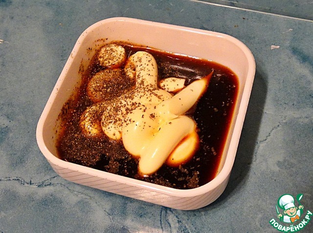 Обмажем получившимся маринадом наше мясо и оставим его помариноваться столько, сколько позволит время до обеда.