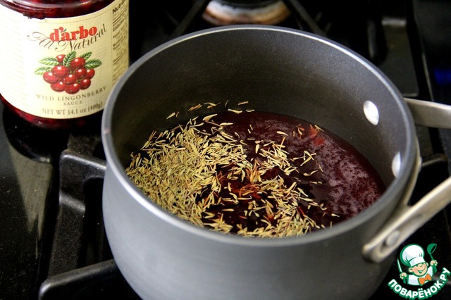 Сначала готовим соус. Для этого в небольшой кастрюле смешиваем брусничный соус, бальзамический уксус, мед, сахар, тимьян и 1/2 ч. л. соли и кипятим на медленном огне в течении 5 минут.