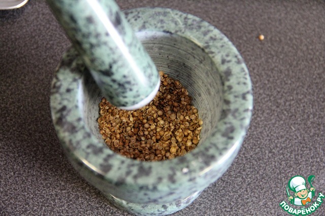 Пока готовится соус, делаем смесь специи. Для этого сначала измельчаем кориандр в ступке