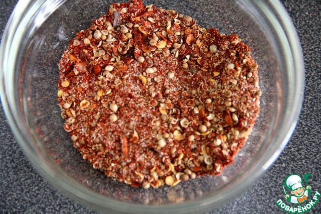 И смешиваем с паприкой, душистым перцем, красным перцем, порошком чеснока и лука, укропом и 2 ч. л. соли.