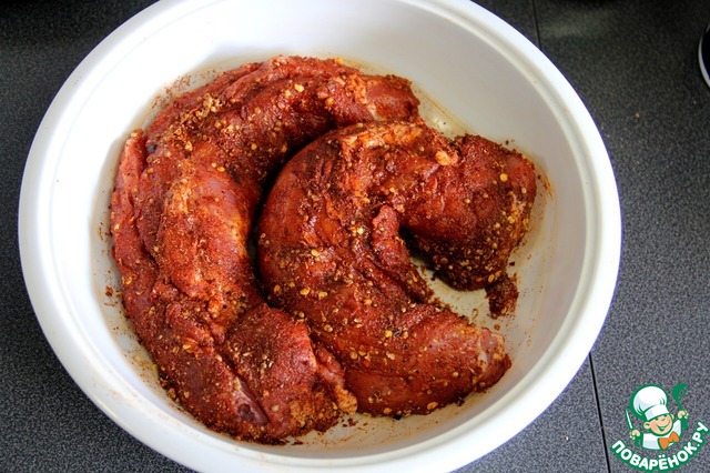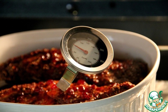 С помощью специального термометра измеряем температуру мяса. Свинина готова, когда температура внутри мяса 80С (160F ).