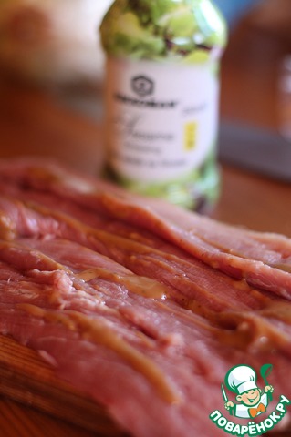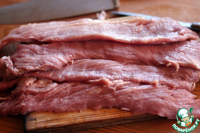 Для начала очистим вырезку от пленок и нарежем ее очень острым ножом вдоль, чтобы у нас получились тонкие и длинные кусочки.