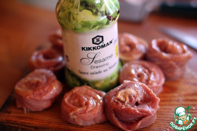 Скрутите каждую полоску в "розочку" и разрежьте поперек. Старайтесь, чтобы "розочки" были одной высоты, тогда мясо приготовится равномерно.