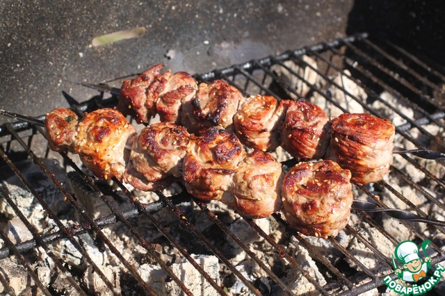 Отправляем на мангал. Следите, чтобы вырезка не пересушивалась, в идеале ее нужно готовить 10-12 минут. За это время она успевает прожариться внутри и получить сверху хрустящую корочку.