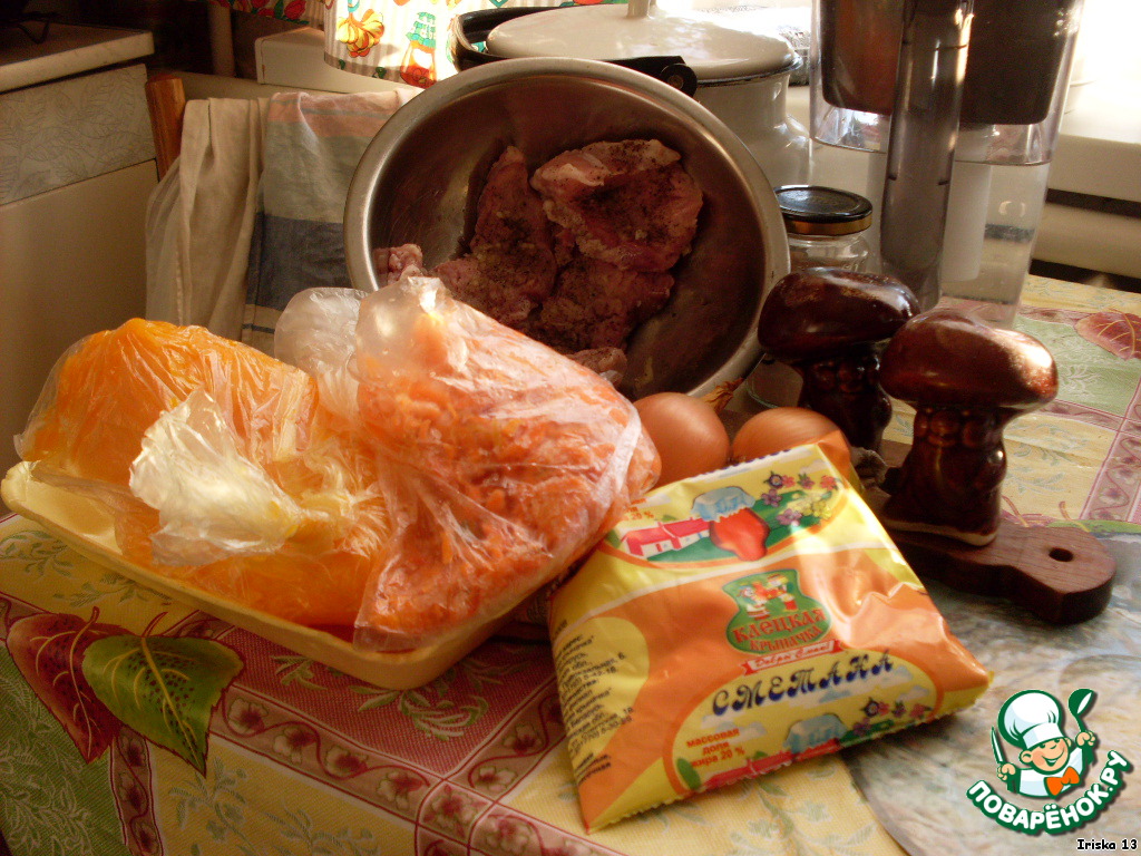 Затем оставшееся мясо, морковь, сметану, лук и тыкву. Заливаем все это обычной водой, чтобы закрылся второй слой мяса (только мясо).
