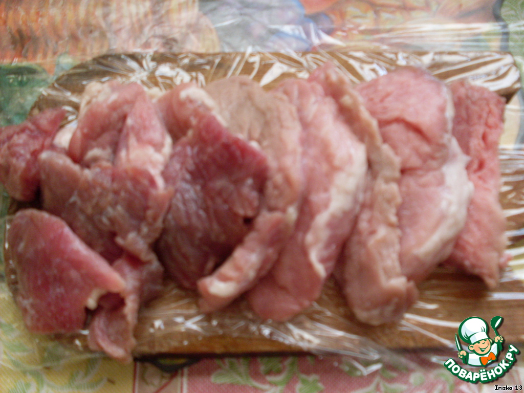 Режем мясо как на отбивные. Я использовала 8 ломтиков. Не отбиваем, а разминаем мясо пальцами.